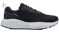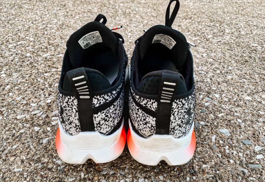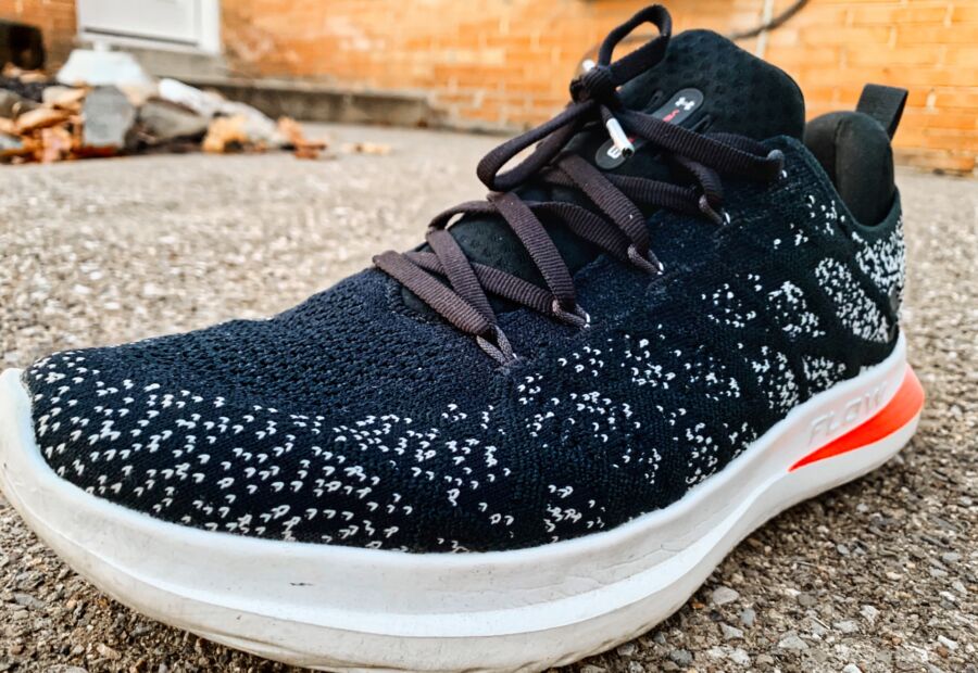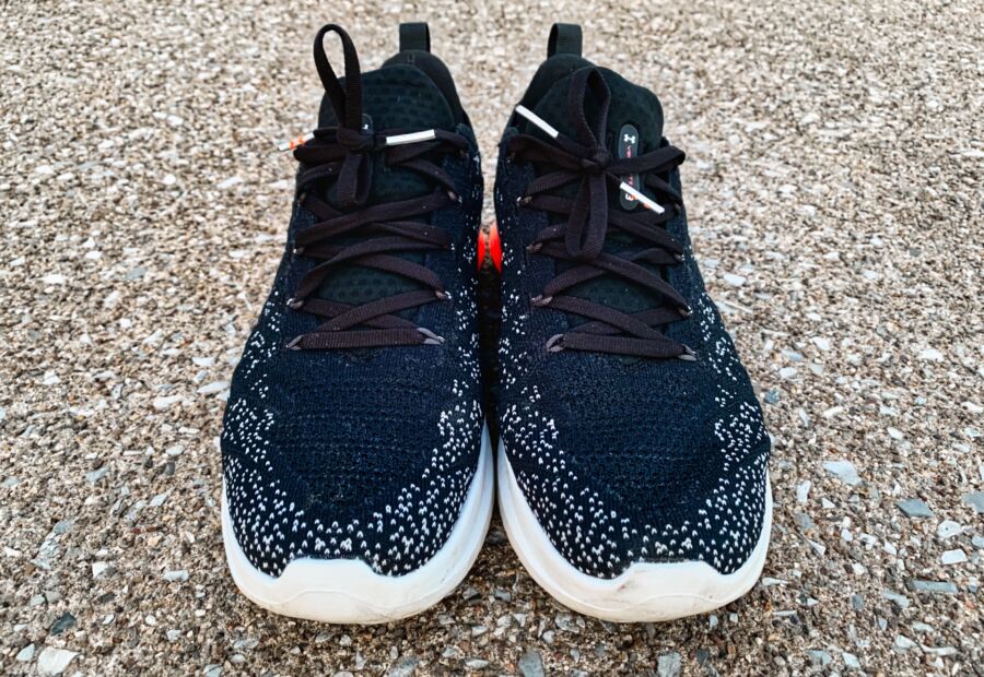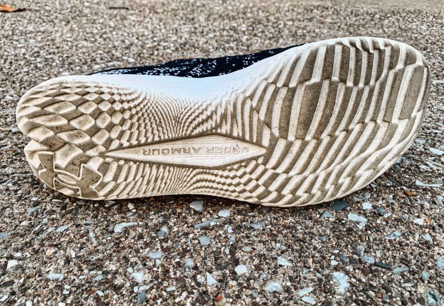 A single piece, flexible knit material is used in the latest version as UA decided to move away from the WARP technology. WARP was a thinner, nylon material with “tape’ overlays across the shoe that was designed to secure your foot and prevent unwanted movement. I didn’t have any issues with movement in the knit material and really liked the black and gray speckled design.